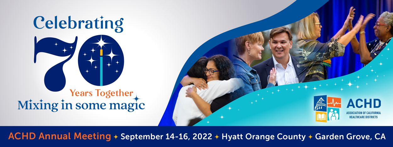 DESCRIPTION:ACHD is excited to announce that\, after three years\, we will once again be meeting in-person for our 70th Annual Meeting. Join us from September 14-16th at the Hyatt Orange County to celebrate ACHD's platinum anniversary.This year's event will feature a wide variety of learning opportunities\, including sessions to help you sharpen your advocacy skills\, create a culture of inclusion\, and power up to energize yourself and serve with joy\, just to name a few. Like last year\, on our first day\, we will be offering a pre-conference Governance Day focused on training elements previously offered at our Leadership Academy. Thursday and Friday will be dedicated to the ACHD 70th Annual Meeting\, which will once again include our ACHD Annual Awards reception. Be sure to take advantage of all of the networking opportunities as well\, such as our morning wellness walks!We can't wait to see you September 14-16th as we Celebrate 70 Years Together supporting health care districts and the communities they serve!  REGISTER NOW BELOW!\n\nPlease note: You can bundle your registration for Governance Day and Annual Meeting and receive a registration discount.\n\nEarly Bird Deadline is Tuesday\, August 30\, 2022. Register by this date and receive a discount!Book your room by Tuesday\, August 30th or before rooms are sold out!